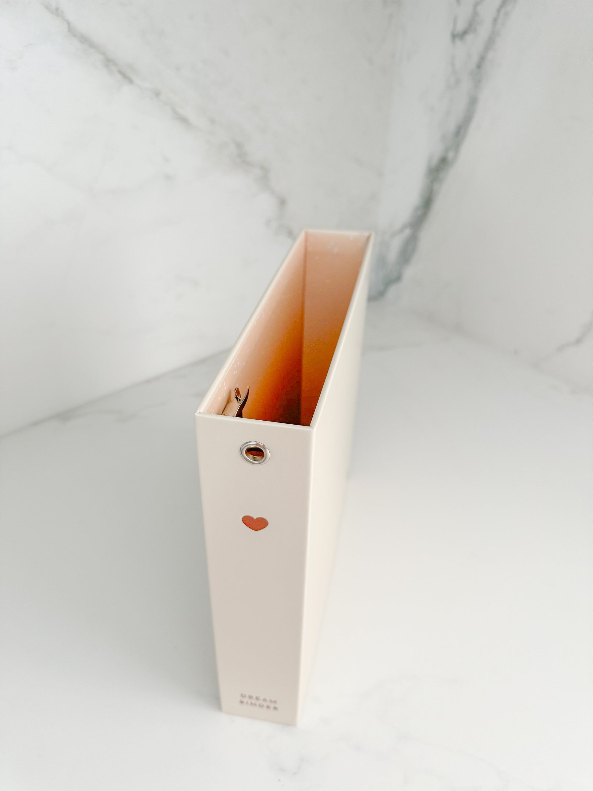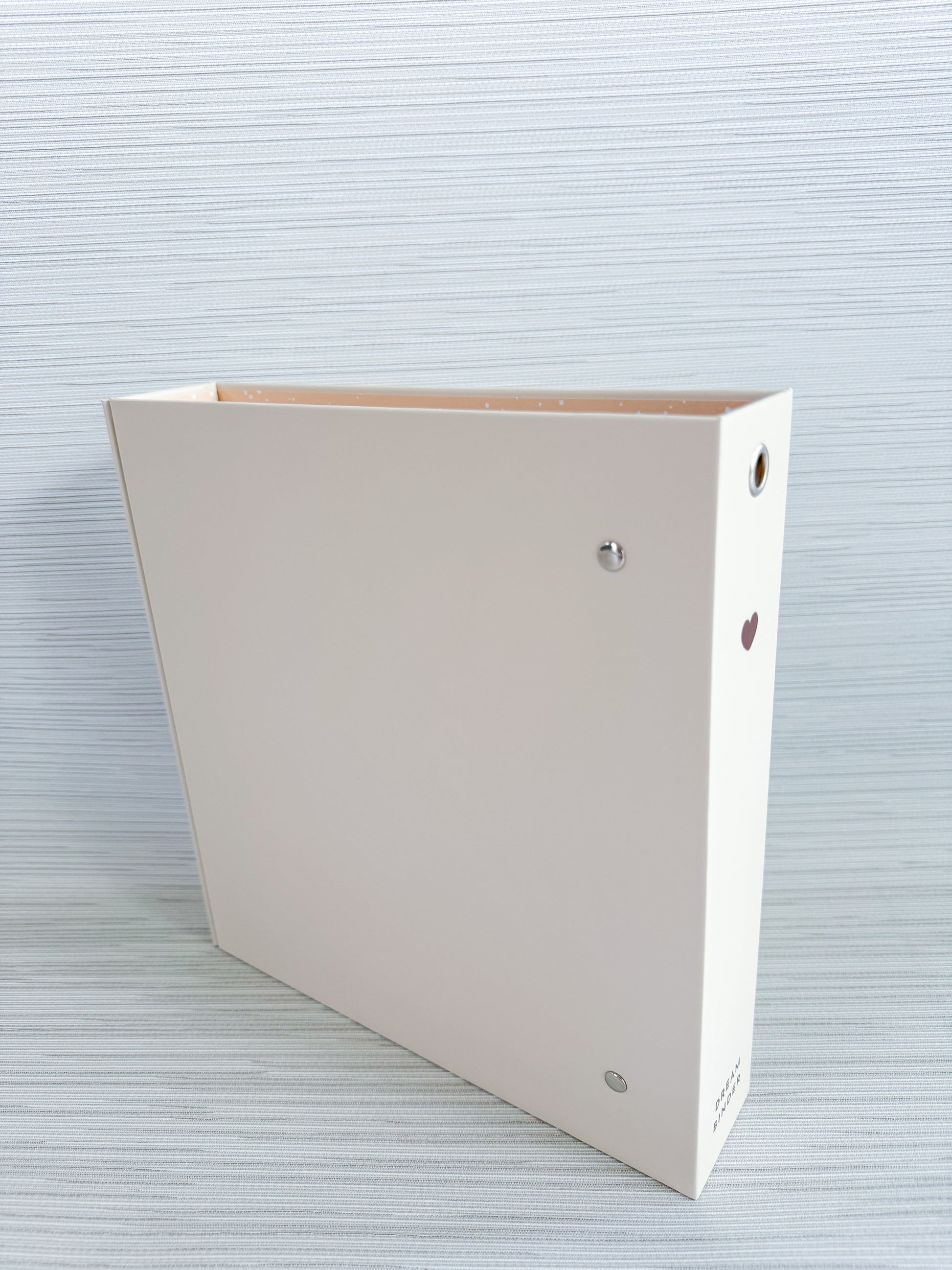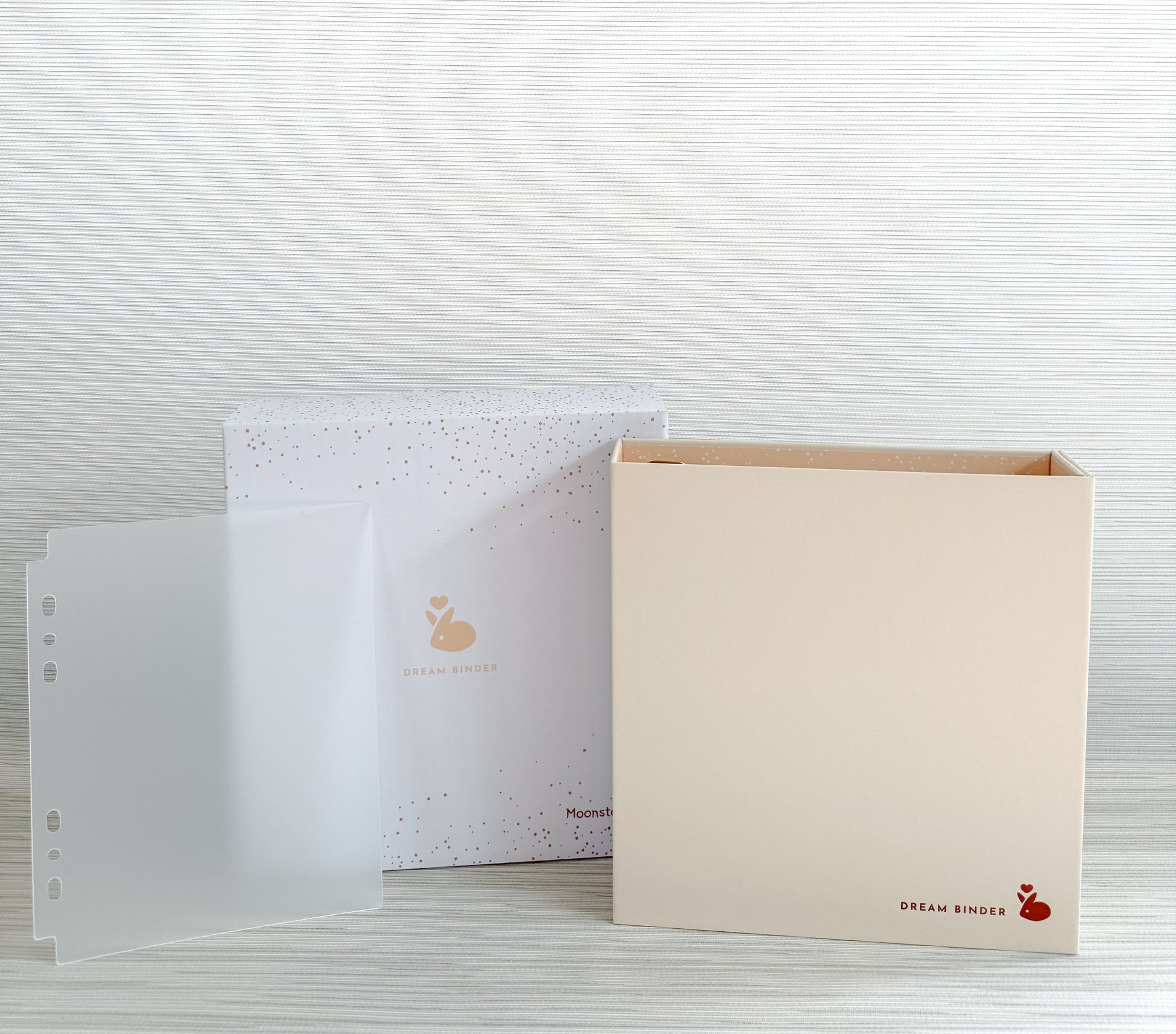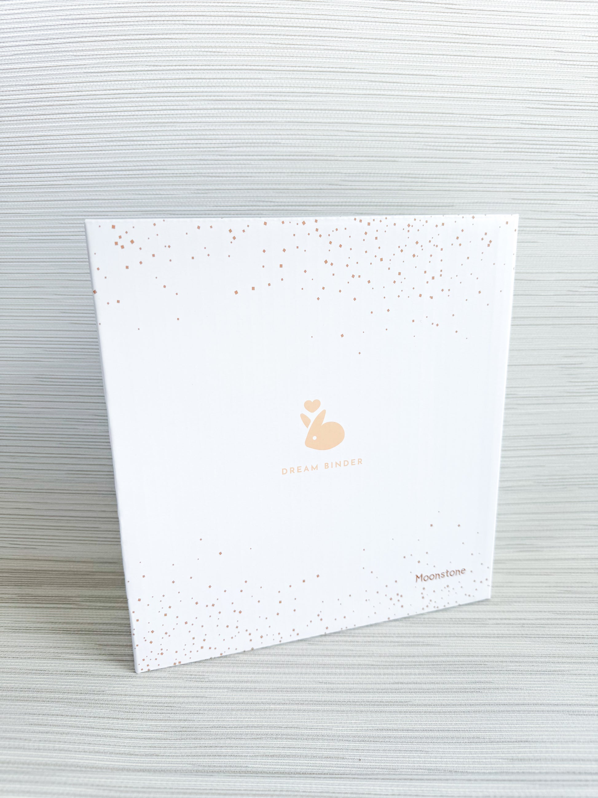 A5 Dream Binder in Moonstone. Moonstone is a neutral matte cream color with debossed bronze foil detail. The spine features a silver eyelet and heart logo. Each Dream Binder comes with a full page frosted PP backboard and 1 pack of binder pages. Each pack consists of 10 pages. Please select the page type when placing an order.