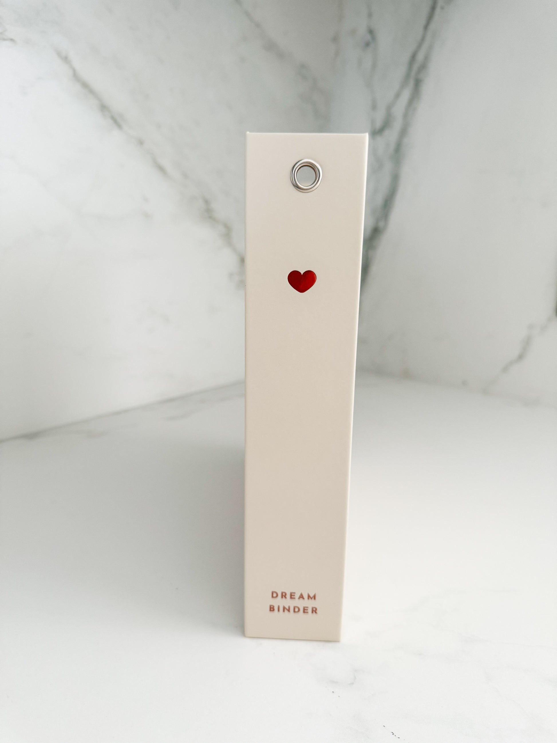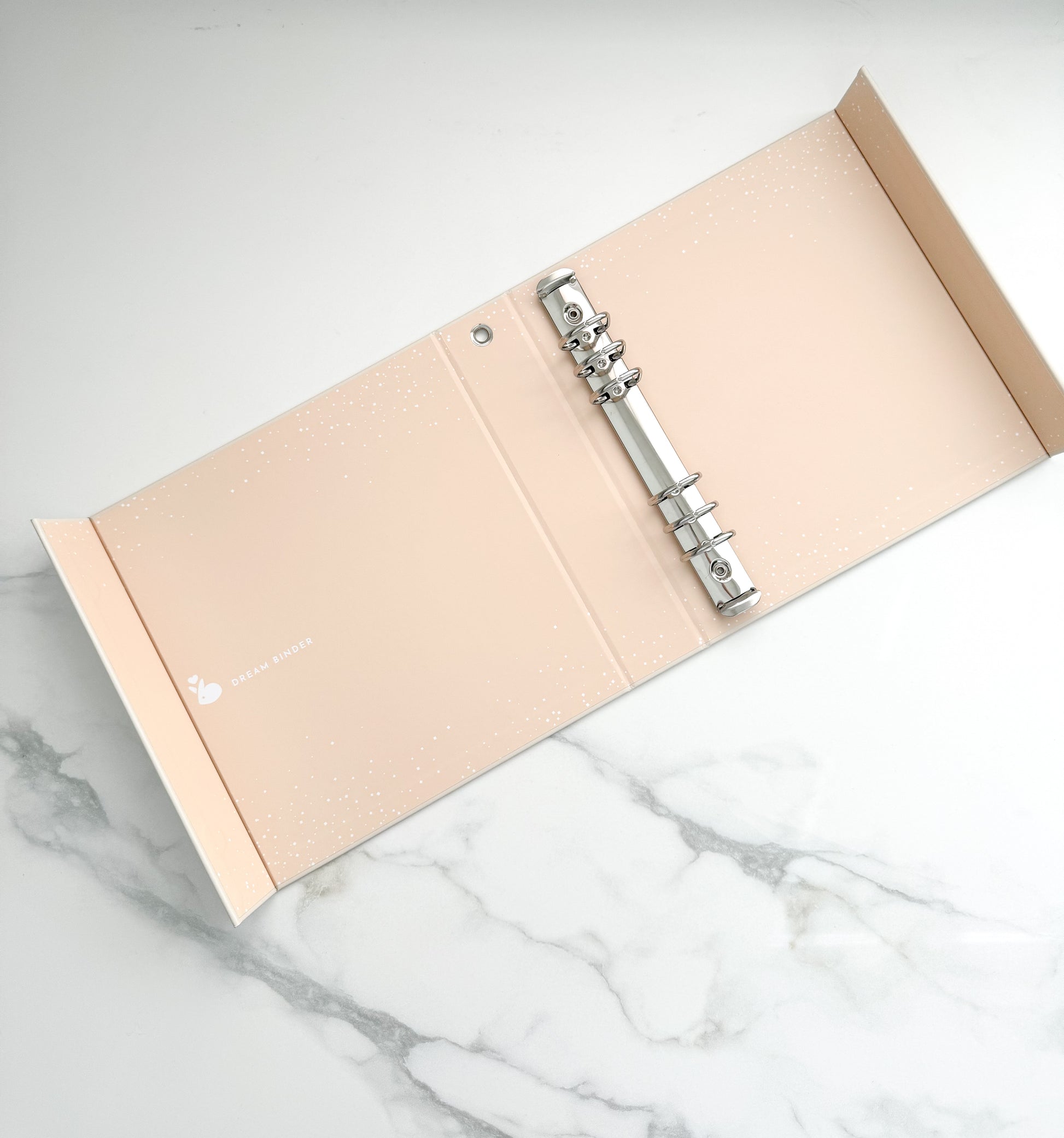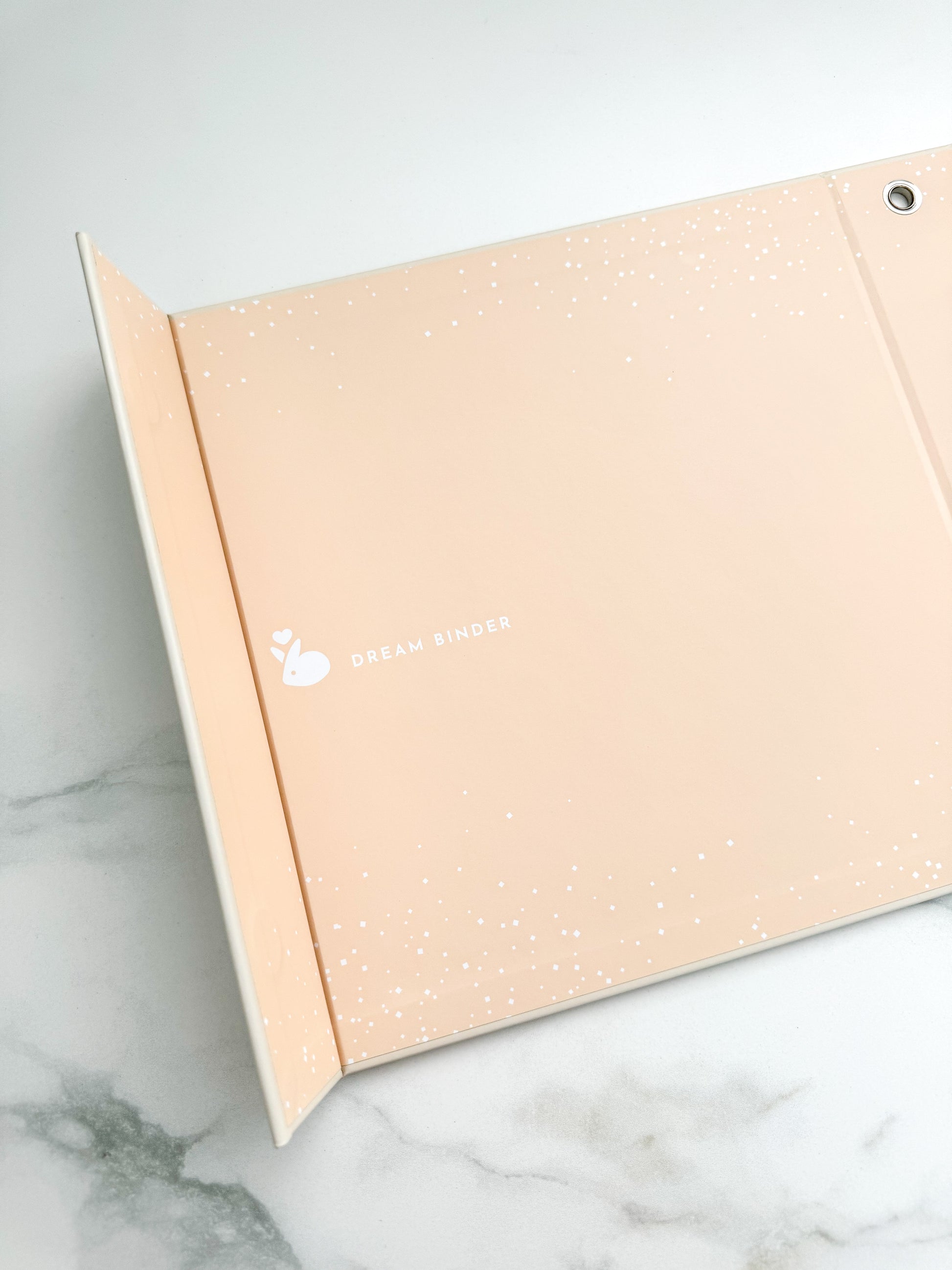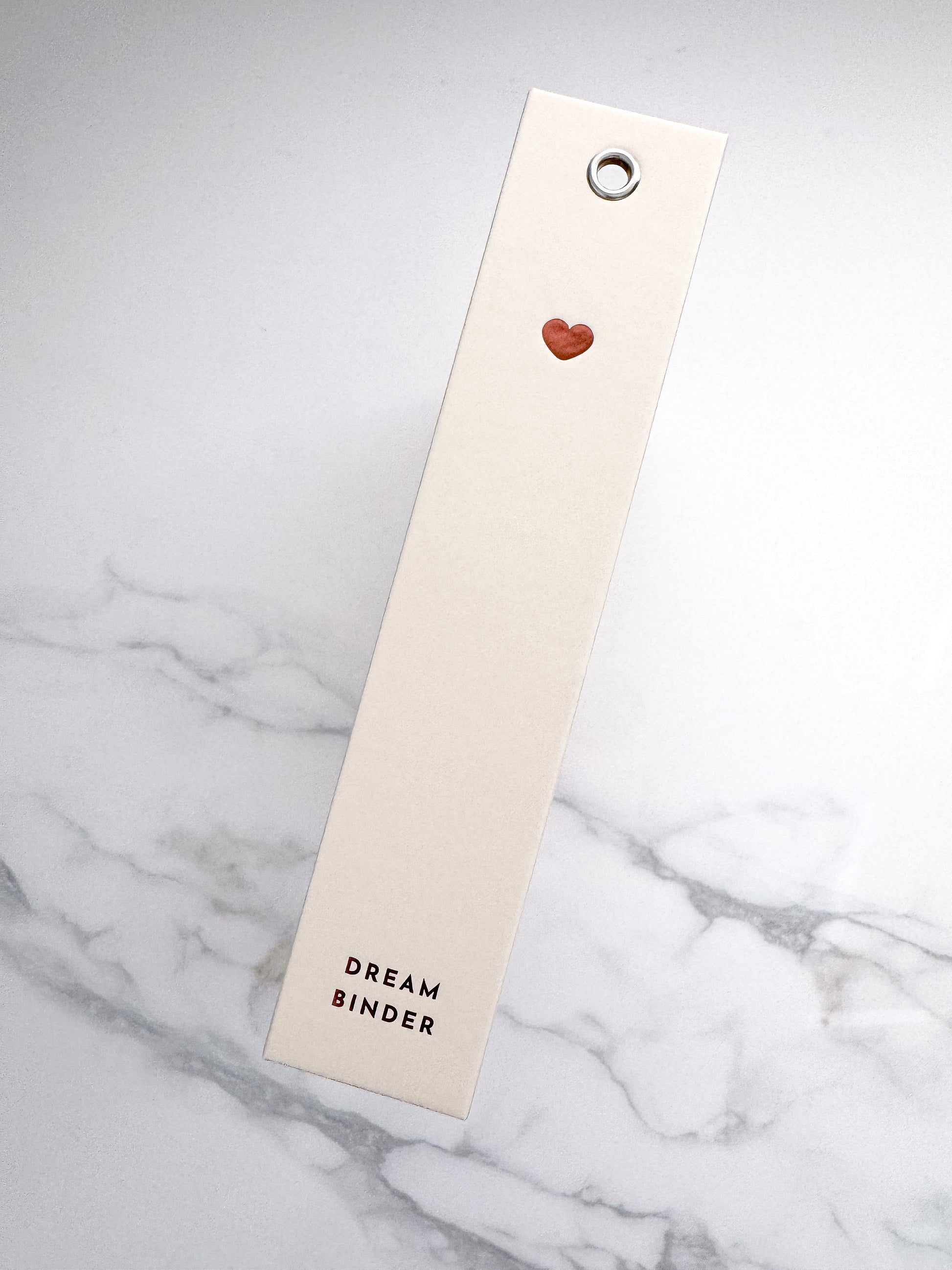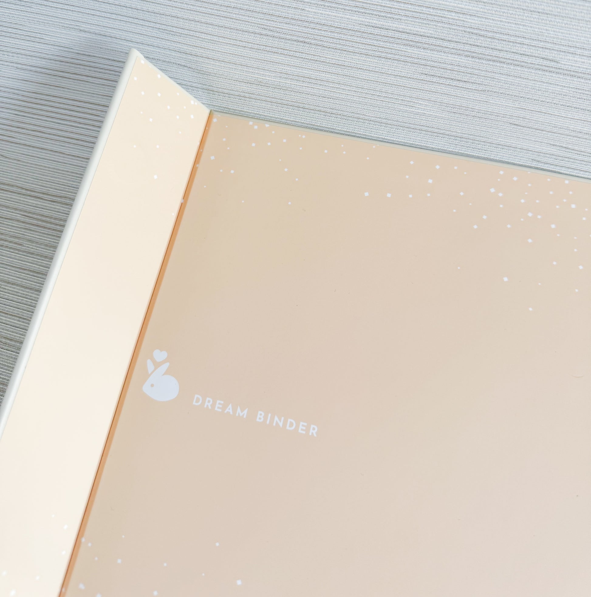 A5 Dream Binder in Moonstone. Moonstone is a neutral matte cream color with debossed bronze foil detail. The spine features a silver eyelet and heart logo. Each Dream Binder comes with a full page frosted PP backboard and 1 pack of binder pages. Each pack consists of 10 pages. Please select the page type when placing an order.