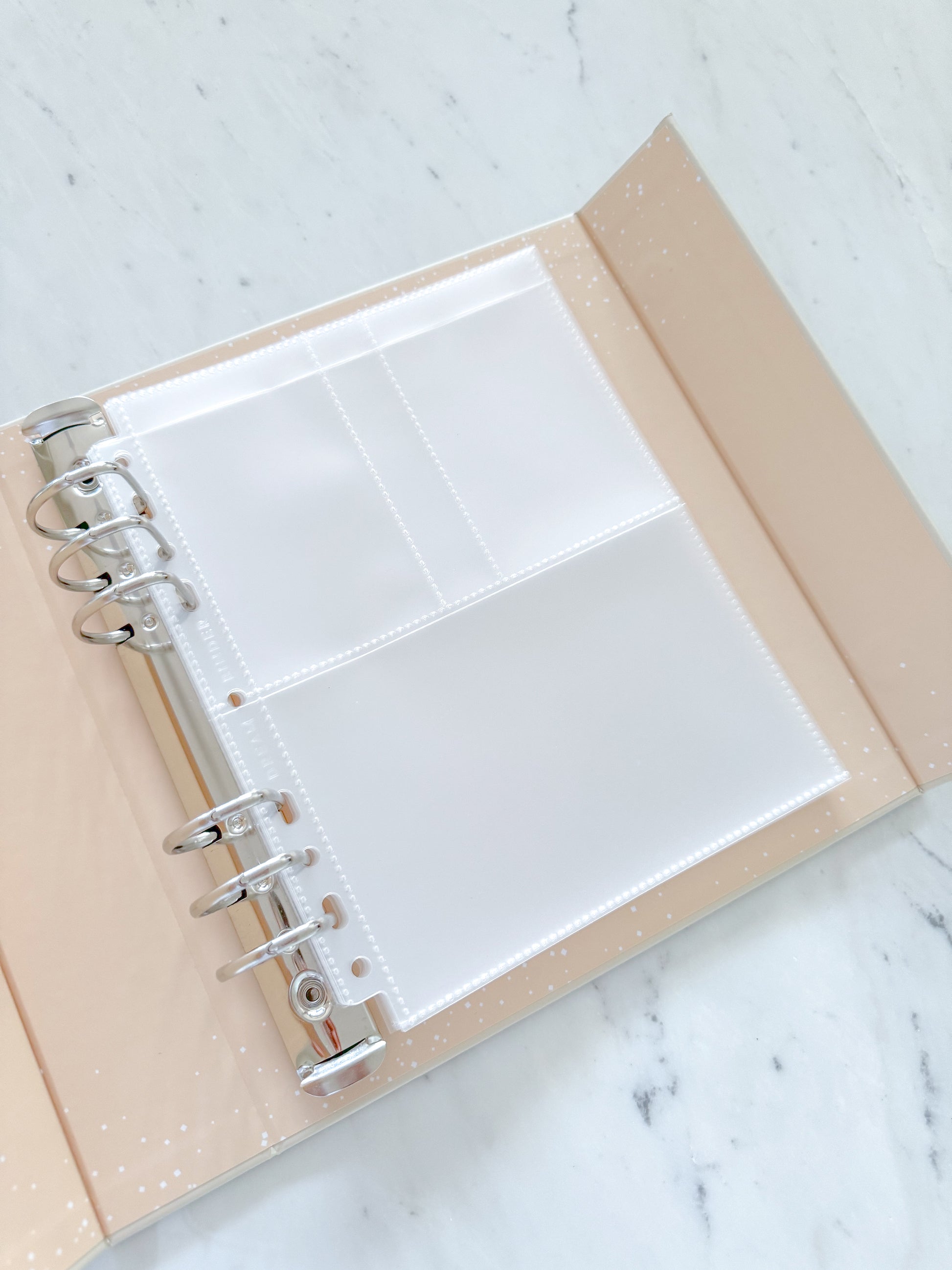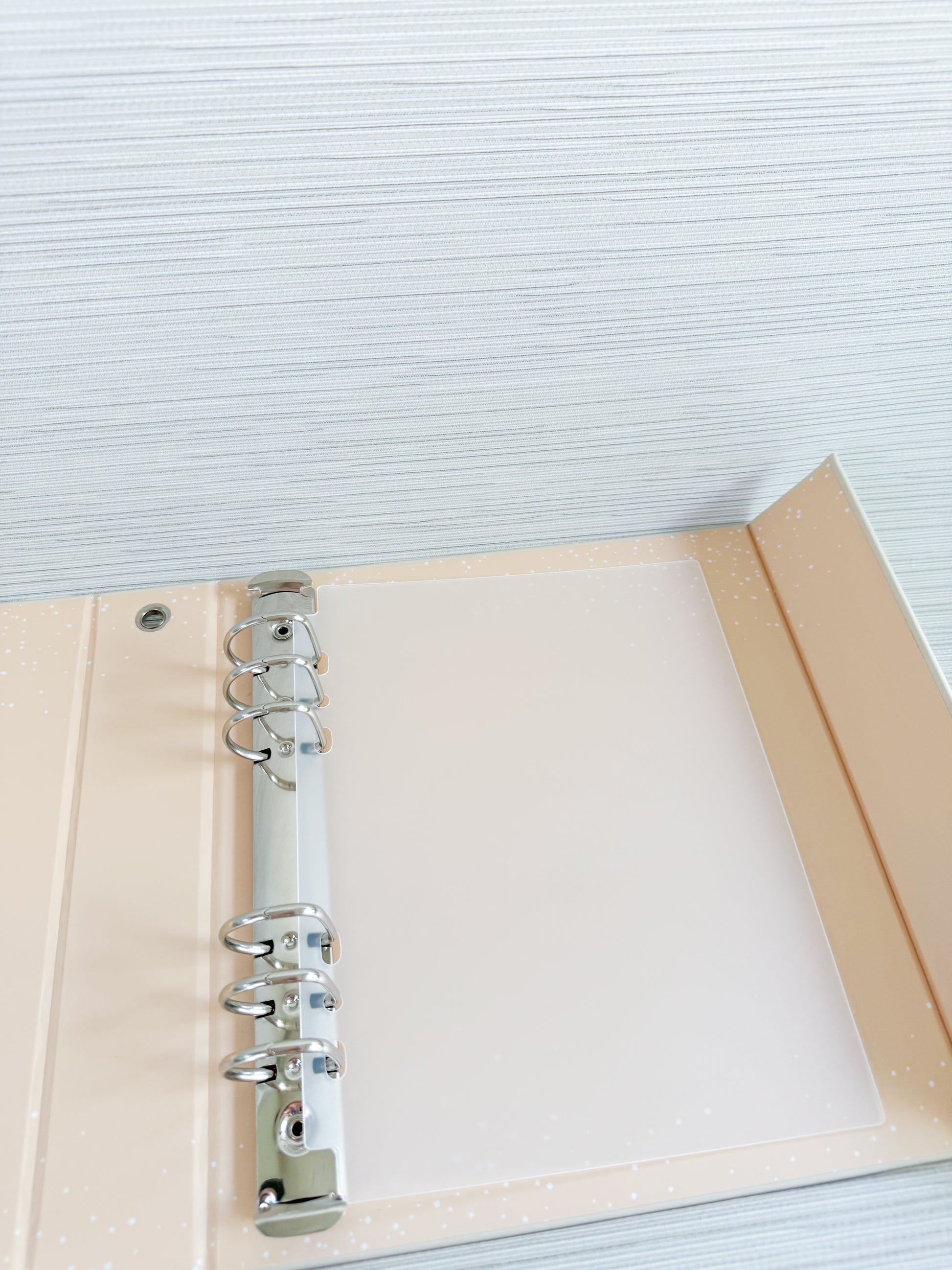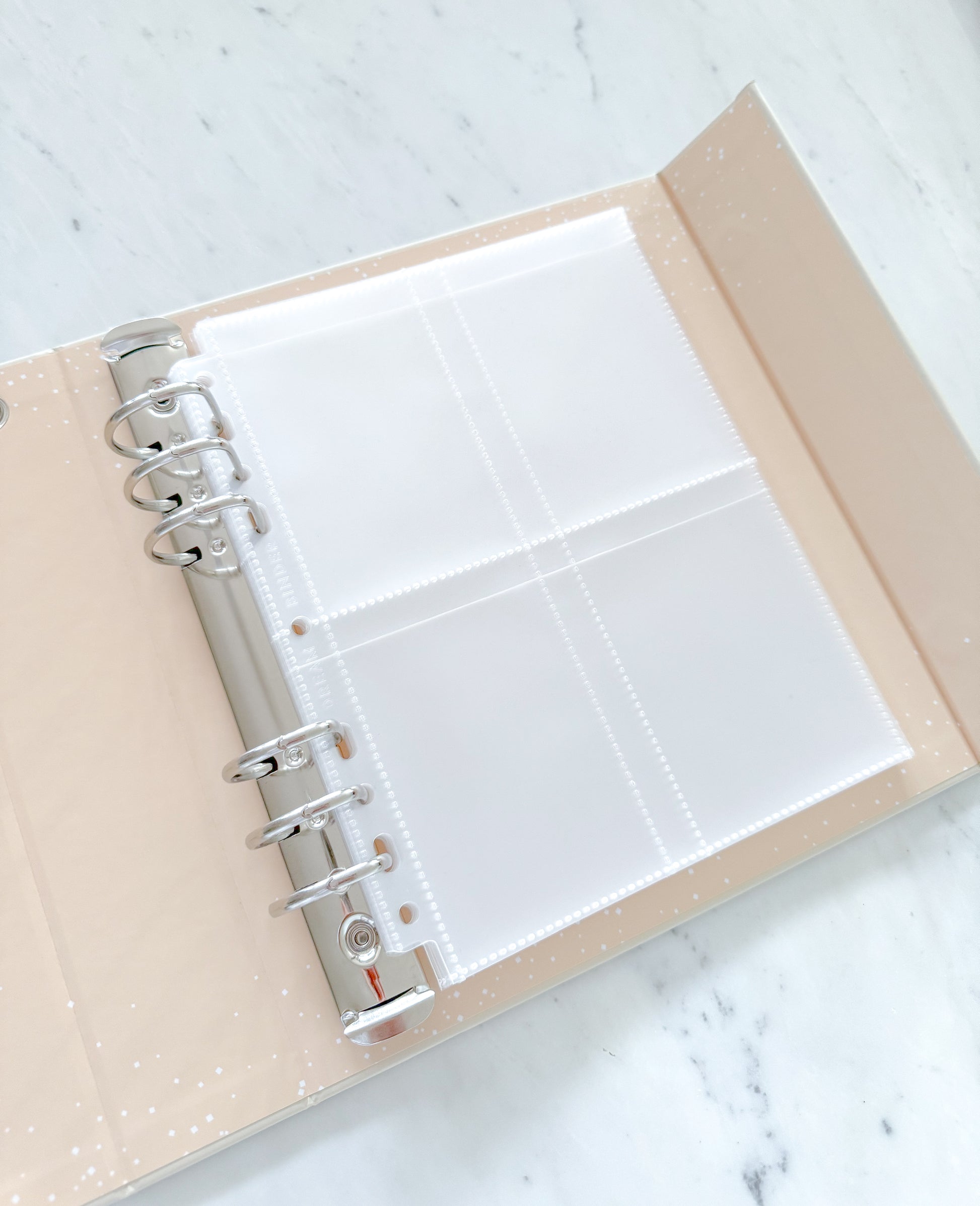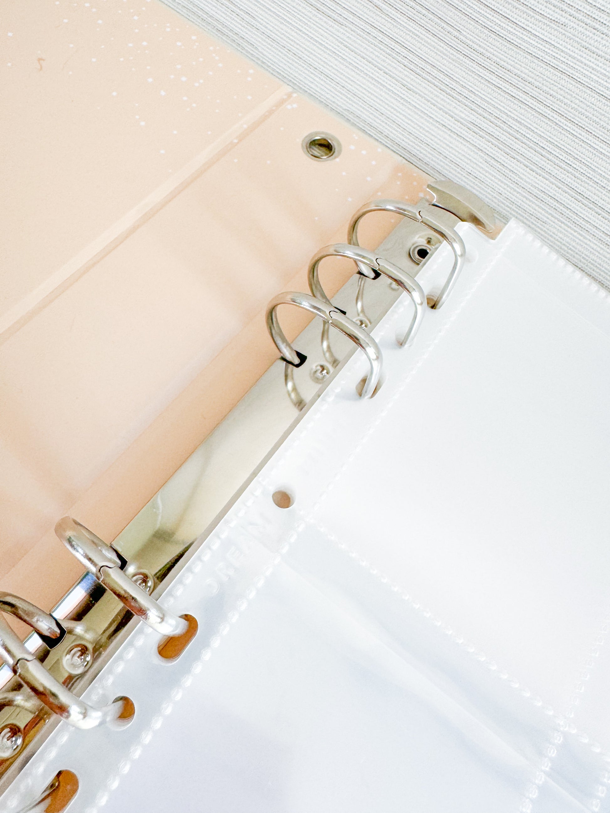 A5 Dream Binder in Moonstone. Moonstone is a neutral matte cream color with debossed bronze foil detail. The spine features a silver eyelet and heart logo. Each Dream Binder comes with a full page frosted PP backboard and 1 pack of binder pages. Each pack consists of 10 pages. Please select the page type when placing an order.