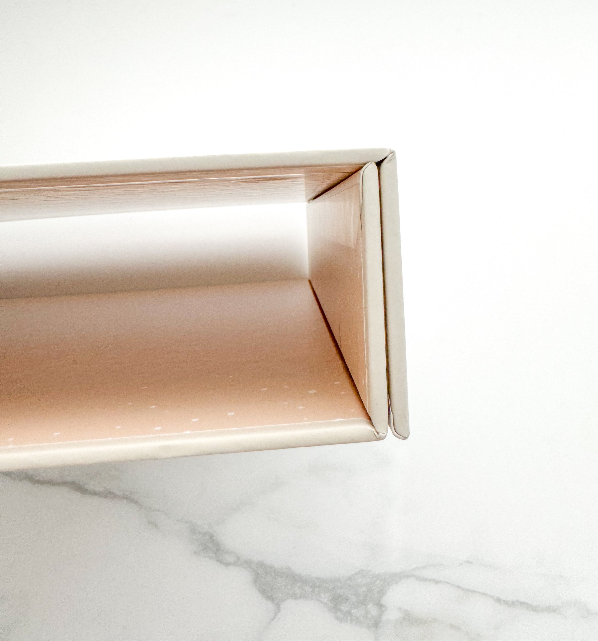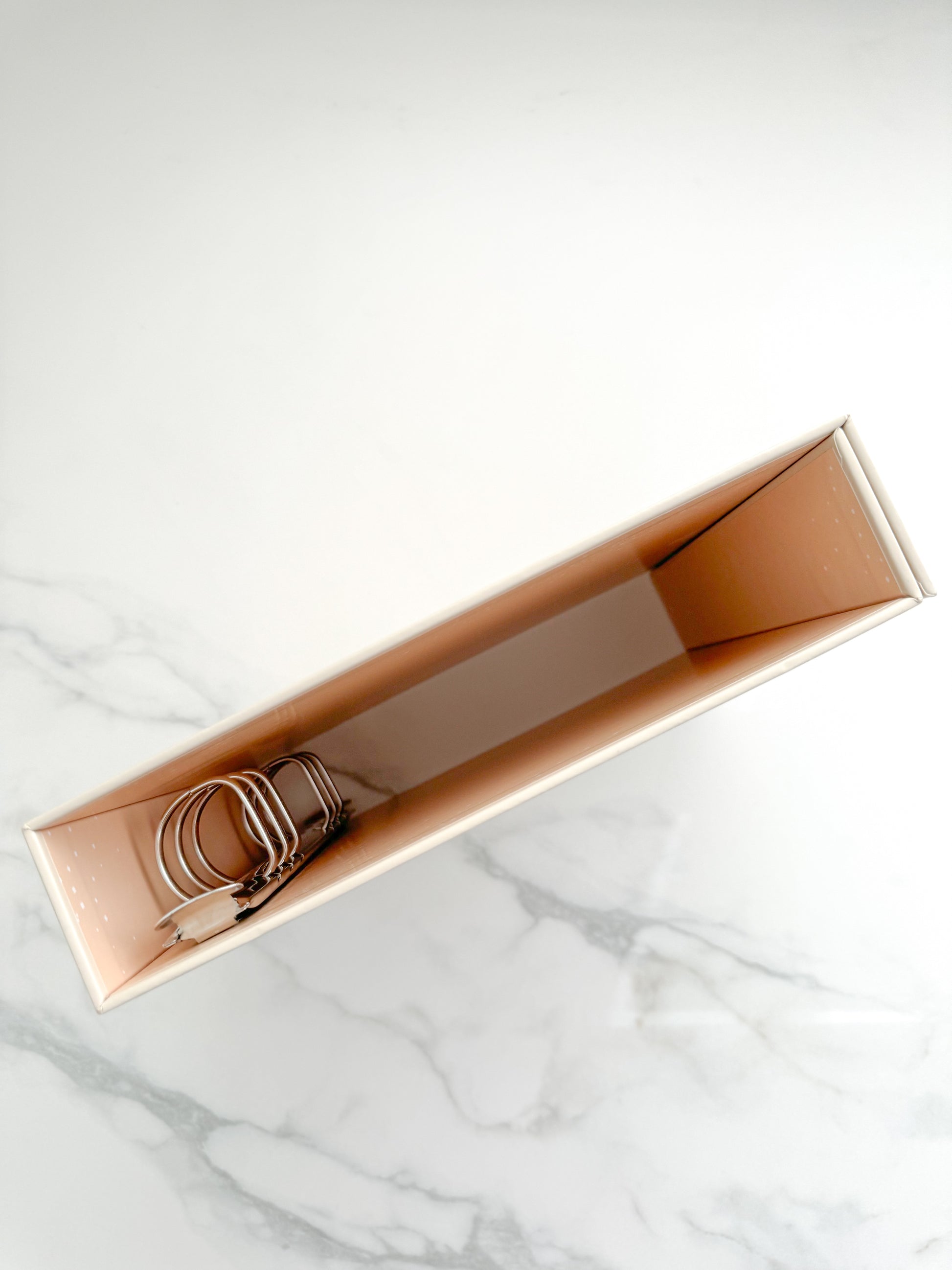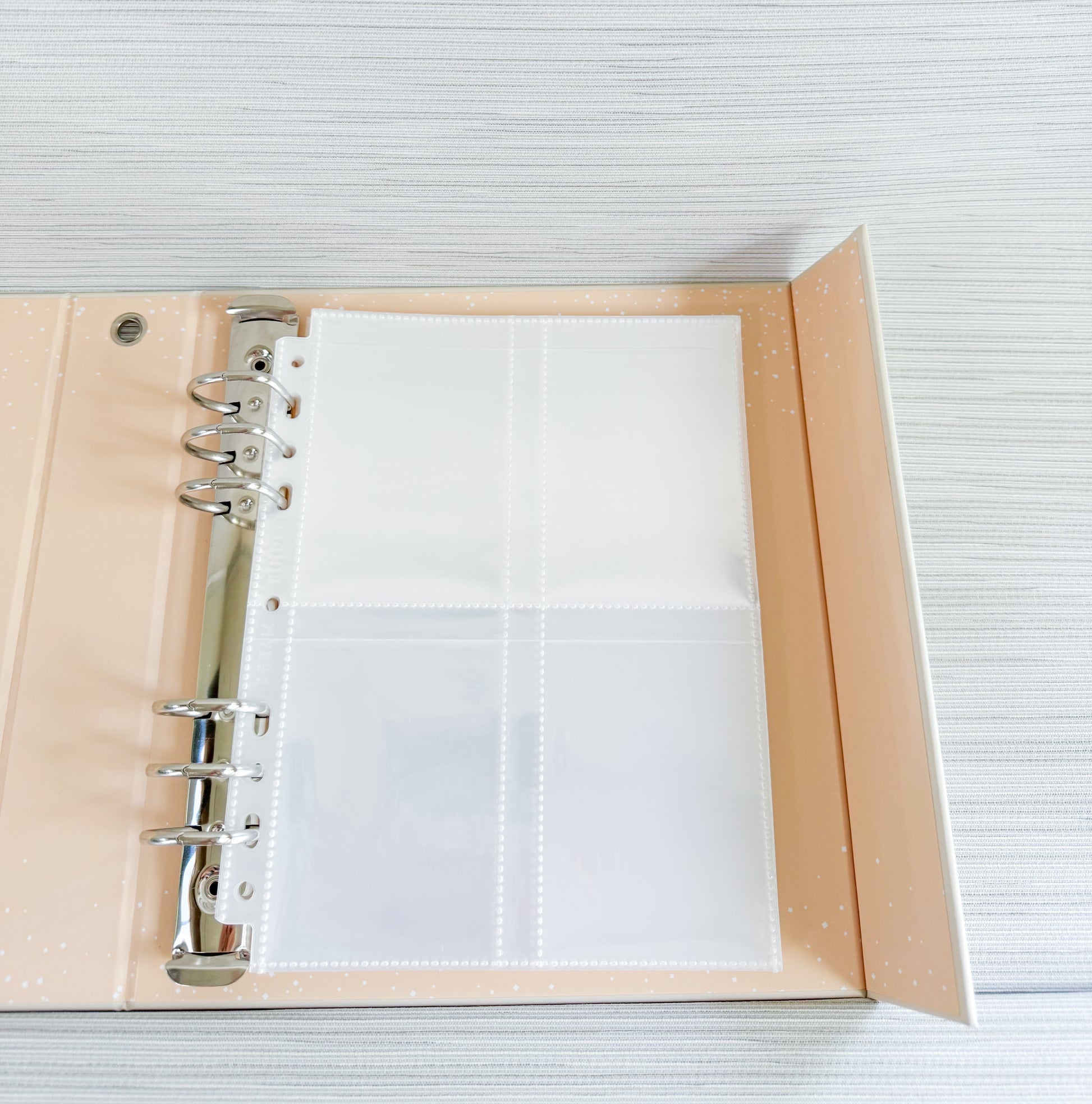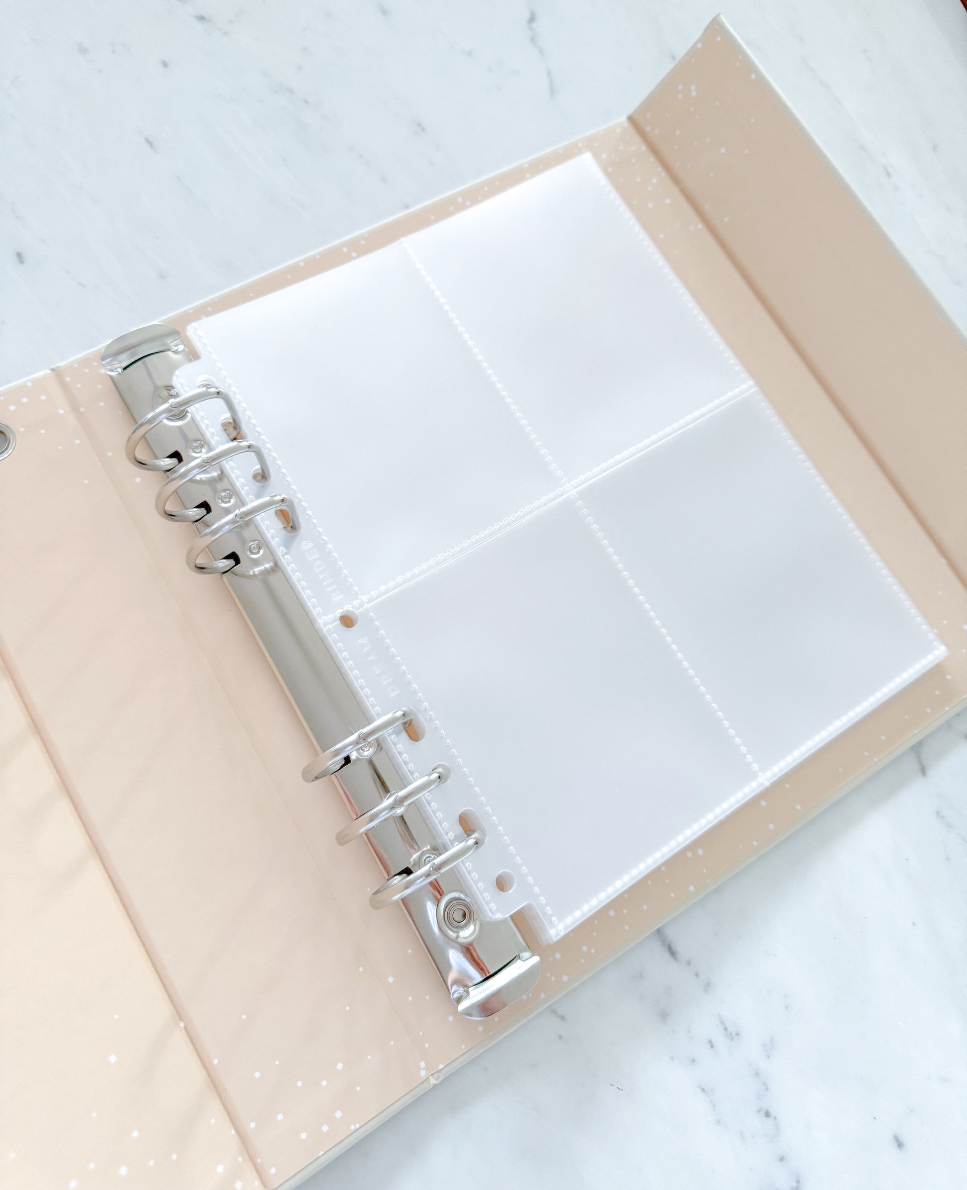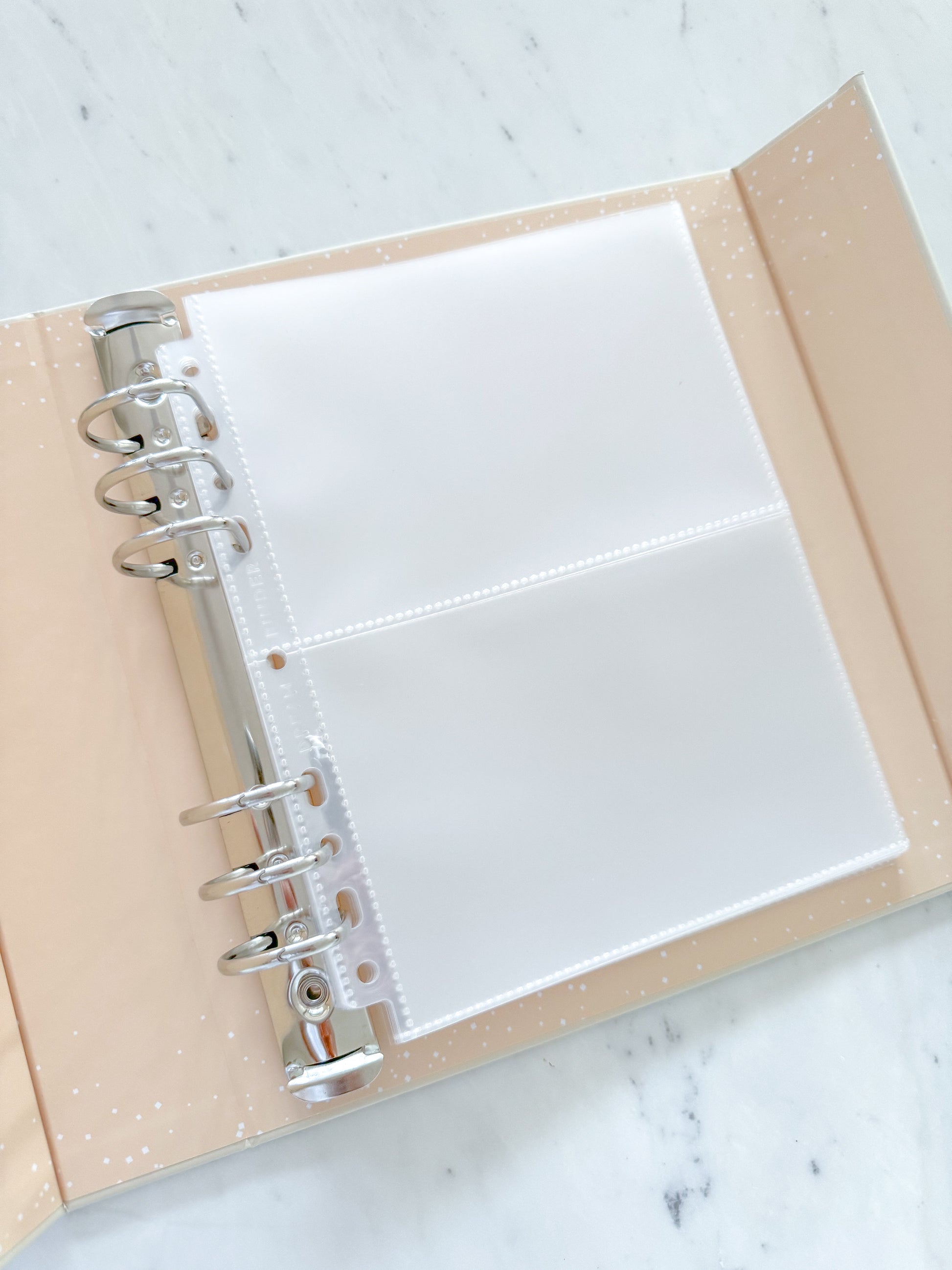 A5 Dream Binder in Moonstone. Moonstone is a neutral matte cream color with debossed bronze foil detail. The spine features a silver eyelet and heart logo. Each Dream Binder comes with a full page frosted PP backboard and 1 pack of binder pages. Each pack consists of 10 pages. Please select the page type when placing an order.